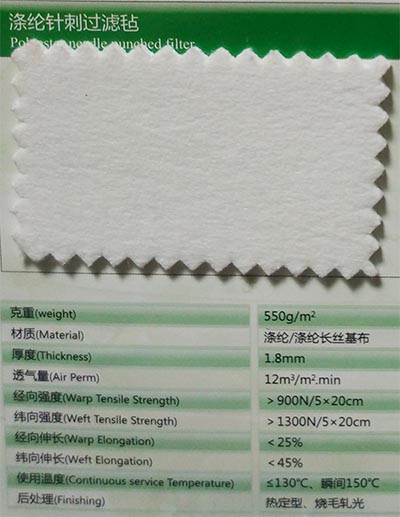該品種采用滌綸纖維在滌綸基布上針刺而成,并采用燒毛壓光、定型等后整理工藝,濾料具有空隙率高、耐磨、耐折、透氣性好等優(yōu)點(diǎn),是目前被廣泛使用的一種常溫過濾材料。